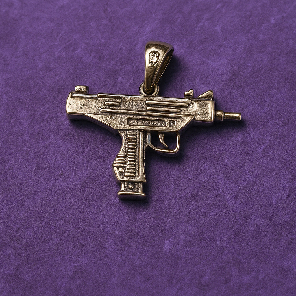Cast in sterling silver, the Uzi pendant is an icon of the streets reimagined through the lens of high luxury. Bold, dangerous, and untamed, it speaks to dominance and the allure of outlaw elegance — where grit meets grandeur.